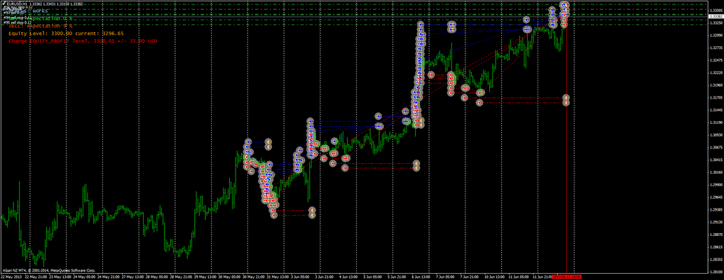 Averaging - losses limitation, all trades are fixed by total profit. Loss making positions lock is used to control the drawdowns. Exponential lot increase is used for total profit output for all opened positions during the trading day/session.